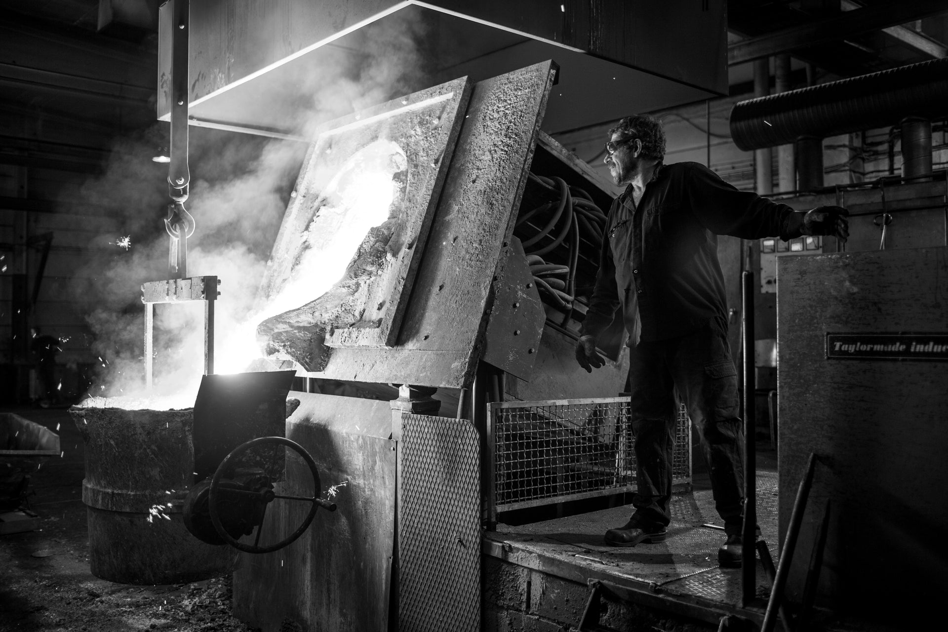Casting the molten iron requires special moulds that can withstand extreme temperatures. Metal tools such as those used in casting aluminium and other materials would not withstand molten cast iron and therefore we use sand moulds that have been compressed under several tons of pressure. The composition of the sand is very important and something we put a lot of time into.