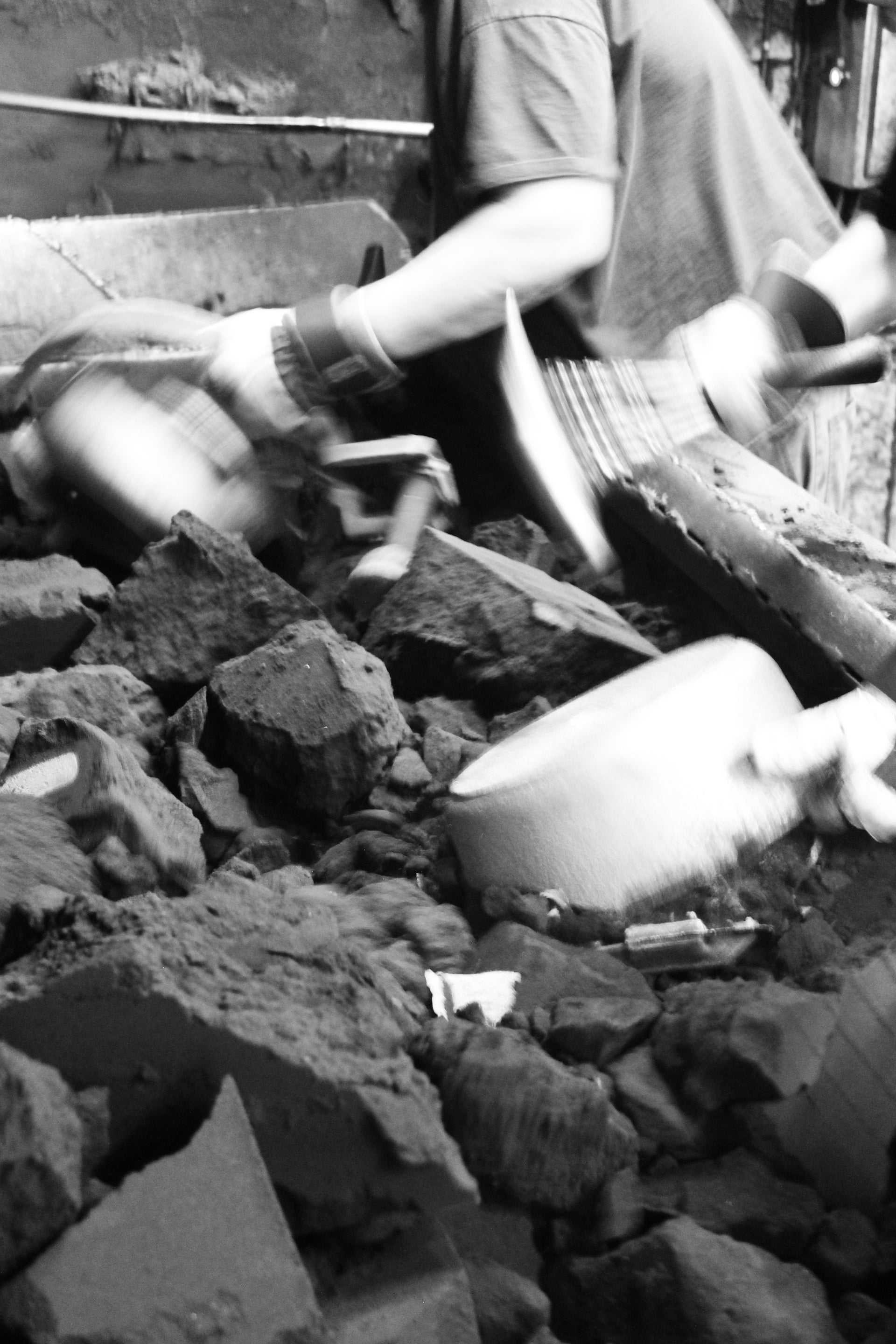And the first results of the process can be seen. A sand mould can be used only once and therefore each product is unique, no two are exactly alike. The sand is recycled and used for another sand mould.